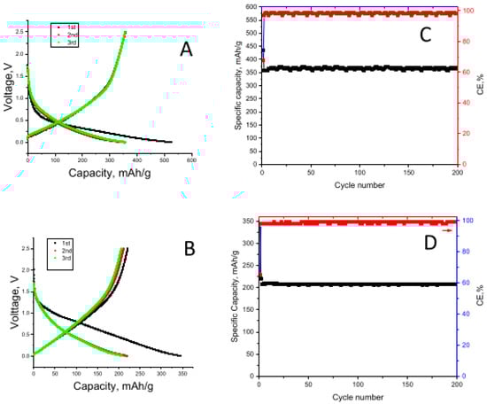 The first-cycle discharge–charge curves and cycling performance of graphene@porous CNFs in Li-ion and Na-ion batteries are shown in Figure 6A–D, respectively. The first-cycle discharge–charge capacities were 523 mAh/g and 356 mAh/g in Li-ion cells and 345 and 221 mAh/g in Na-ion cells, respectively. The Coulombic efficiencies of the graphene@porous CNFs in Li- and Na-ion batteries were 68% and 64%, respectively, while the Coulombic efficiencies for the CNFs were 63% and 49%, respectively. Improved Coulombic efficiencies with the addition of graphene were reported by Dufficy et al. [11] alongside the low irreversible capacity values, which are explained by hindered side reactions between Li ions/electrolyte and residual oxygen and nitrogen compounds in the electrodes.