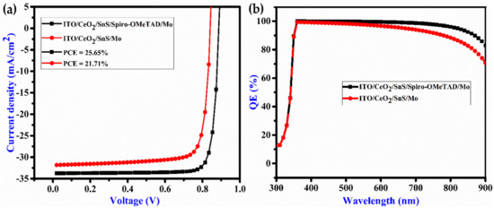 | ITO/CeO2/SnS/Spiro-OMeTAD (simulated) | 0.887 | 33.74 | 85.61 | 25.65 | This paper |