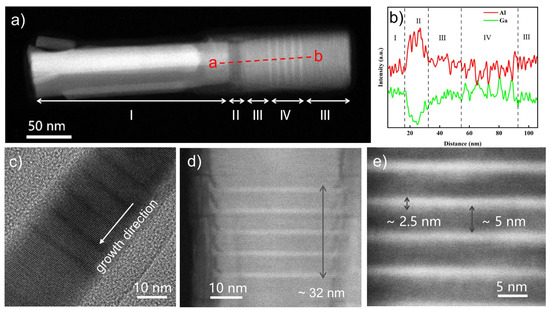 The morphology and atomic structures of the AlGaN Qdisk nanorods were examined using STEM and the results are shown in Figure 3. One independent AlGaN nanorod is illustrated in Figure 3a, which could be divided into four parts. Region Ⅰ was the GaN nanorod template, which was approximately 200 nm in length. Region Ⅱ was an Al-rich AlGaN region between the GaN and AlGaN nanorods. When the GaN nanorods were exposed to Al and Ga atoms simultaneously, Al-rich AlGaN was more favorable for nucleation due to the higher stability of the Al–N bond than that of the Ga–N bond, thus causing the presence of the Al-rich AlGaN region II. Then, the Ga atoms accumulated to a certain level, transforming the Al-rich AlGaN region into a stable AlGaN growth region (region III) [26]. The next two regions, Ⅲ and Ⅳ, were the undoped AlGaN region and the active AlGaN/GaN Qdisk region, respectively. Our elemental analysis using energy dispersive x-ray (EDX) further confirmed the four separate regions, as shown by the Al and Ga distributions that were scanned along the line a–b in Figure 3b. Regions Ⅰ, Ⅱ, and Ⅲ and the Qdisk region Ⅳ could be clearly distinguished. The variations in the Al and Ga components met the characteristics of each region.