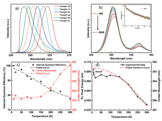 (a) PL spectra of the AlGaN nanowires with different emission wavelengths, (b) TDPL spectra of the AlGaN nanowires emission at 305 nm, (c) IQE and wavelength change curves with temperature change, (d) the wavelength shifts fitting curve using the Varshni empirical formula.