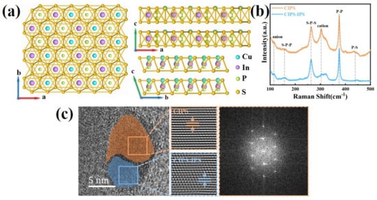 The room-temperature crystal structure of CIPS was first discovered in 1995 using single-crystal X-ray diffraction [24]. Bulk CIPS is composed of vertically stacked, weakly interacting layers bound together by vdW interactions. The metal cations and P–P pairs fill the octahedral voids in the sulfur framework in a CIPS crystal (Figure 1a). A complete unit cell is reported to consist of two adjacent monolayers due to the site exchange between Cu and the P–P pairs from one layer to another [25]. Figure 1b shows two typical Raman spectra measured in different regions of a CIPS flake on a Pt/Si substrate. In general, we observed five Raman active modes, including δ(S–P–P) modes at 162.9 cm−1, δ(S–P–S) modes around 226.1 cm−1, and 263.3 cm−1, an active mode from the cations at 303.2 cm−1, andυ(P–P) and υ(P–S) modes at 374.3 cm−1 and 436.4 cm−1, respectively. The tested Raman results are consistent with the former reports on CIPS crystals [26,27]. P–S bond stretching vibrations (υ) can be resolved to A1g + A2u + Eu + Eg. The S–P–S modes change the S–P–S angles, resulting in another set of A1g + A2u + Eu + Eg. The P–P bond is associated with bending the PS3 groups, which accounts for Eu + Eg. Twisting (P2S6)4− oscillation is related to the A1u mode [27]. The Raman spectra in orange showed a strong peak at ~303 cm−1, which corresponds to the cations [26]. The blue curve showed a weak and broad peak at ~303 cm−1, which is mainly related to the reduction of Cu content. It is believed to originate from the paraelectric phase of CIPS–IPS, where IPS stands for In4/3P2S6, appearing in the flake due to Cu+ deficiency [26,27]. The transmission electron microscope (TEM) images show two structures on the same CIPS flakes (Figure 1c), which correspond to the monoclinic and triclinic phases, consistent with the Raman spectrum.