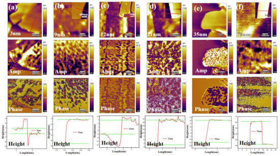 PFM images including height, amplitude, and phase image (upper three), and height curves (bottom row) of CIPS flakes with different thicknesses. (a) 3 nm, (b) 9 nm, (c) 12 nm, (d) 21 nm, (e) 35 nm, and (f) 78 nm.