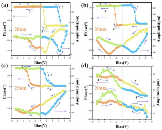According to the above results, we chose the CIPS sample with a thickness of 20 nm to investigate the ferroelectric switching behavior. Well-defined butterfly loops of the saturated PFM amplitude and the distinct 180° switching of the phase signals were observed, as shown in Figure 3a,b, indicating switchable ferroelectric polarization in the CIPS flakes with different thicknesses (28 nm and 20 nm). We divided the hysteresis loops into four sections, as shown in Figure 3a–c, and observed that the direction of the polarization switching of CIPS was consistent with that of PVDF [28], showing negative piezoelectricity, which arose from the low polarization of Cu atoms in the CIPS layer [14]. We still observed abnormal butterflies and switching of the phase loops in the 25 nm and 20 nm CIPS, however, as shown in Figure 3c,d. There are the following several possible reasons for the abnormal switching loops: One, when sweeping the electric fields in the reverse sequence, the piezoelectric response curves show asymmetric shapes. This phenomenon was attributed to the existence of remnant-injected electrons. Due to the different diffusion distances in both the positive and negative electric range, the injected electrons cannot be eliminated absolutely when applying a lower electric field [29]. Two, the abnormal hysteresis loops may also relate to negative electrostriction and electrostatic signal contributions accompanied by charge injection during scanning [30]. Three, abnormal domain switching is generated due to in-plane ionic migration in CIPS [31]. Since the Cu is deficient, when applying an electric field, a few regions of the CIPS undergo a chemical phase separation into a paraelectric In4/3P2S6 phase and a ferroelectric CuInP2S6 phase [32]. Abnormal hysteresis loops may be from the local paraelectric phase of the CuInP2S6–In4/3P2S6 region due to Cu deficiency [27].