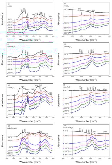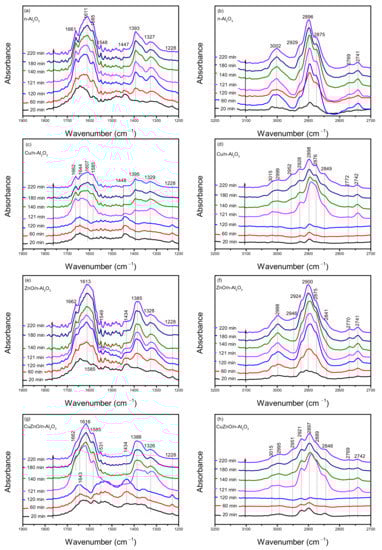| 100 | Bicarbonate ↓, monodentate, carbonate bidentate formate | Bidentate carbonate (ZnO) ↓, bicarbonate (Al2O3) ↓, polydentate carbonate (Al2O3 or ZnO), bidentate formate (ZnO and Al2O3) | Bicarbonate (Al2O3) ↓, bidentate formate (Al2O3), polydentate carbonate | Bicarbonate (ZnO) ↓, polydentate carbonate (Al2O3) |
