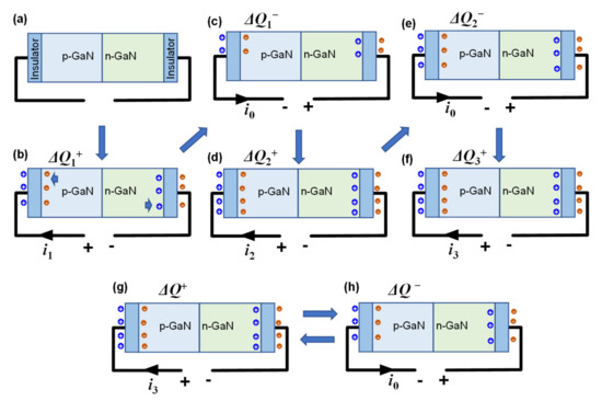 The exponential decay process in the current can be explained as shown in Figure 3. The NCI–LED is equivalent to an LED sandwiched between two insulators, as schematically illustrated in Figure 3a. When the first forward voltage is applied, positive and negative charges, respectively, accumulate at the electrode/insulator interface, creating a potential drop across the LED. Thus, the electrons and holes inherent in the LED are transported to the MQW for electroluminescence, leaving ionized donor/acceptors on both terminals of the LED. This process corresponds to the charging process of the equivalent capacitor. The number of the transferred charges is defined as ΔQ1+ and the relevant forward current is i1, as shown in Figure 3b. Then, when the first reverse bias voltage is applied, the amount of accumulated charge at the electrode/insulator interface decreases, corresponding to the discharge process of the capacitor. As the reverse current (i0) of the LED is much smaller than the forward current (i1), the accumulated charge does not completely disappear during reverse bias. As a result, there is still charge accumulation on both sides of the insulators, as shown in Figure 3c. The number of the reduced charges is defined as ΔQ1−. Obviously, ΔQ1− is much smaller than ΔQ1+. As shown in Figure 3d, the second forward bias would charge the capacitors again with a charging current of i2, causing more charges to accumulate at the electrode/insulator interfaces. As is well known, during the charging process of a capacitor, the charging current decreases as the number of stored charges increases. Thus, i2 is smaller than i1, and ΔQ2+ is smaller thanΔQ1+. Similarly, when the second reversed bias is applied, discharging process results in a slight decrease of accumulated charges, and there are still a large number of charges accumulated on both side of the insulators (Figure 3e). Additionally, the third forward bias would charge the capacitors again with a smaller charging current of i3 (i3 < i2), as shown in Figure 3f. The final result is that the forward current decays exponentially, similar to the exponential decay of the charging current in a capacitor.
