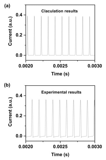 (a) Calculation current obtained from Equation (15) when the device in operating in the stable state. (b) Experimental time-varying current when the device is operating in the stable state.