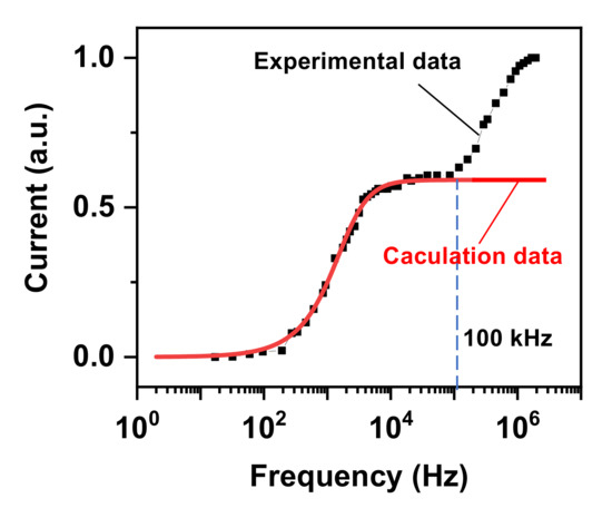 Equation (19) is the basic equation for NCI–LEDs, where the i–v relationship of an LED is approximately simplified to a direct current-driven PN junction. In addition to the above approximations, we make three approximations in solving the above equations. The first approximation is that we ignore the resistance on the circuit. In fact, the resistance on the circuit comes from the wire resistance, which is less than 0.5 Ω. According to the experimental results, the peak current of the circuit is typically less than 10−5 A when nanoscale LEDs are used. It can be seen that the applied voltage mainly falls on the NCI–LED. Therefore, we make the first assumption, which is to ignore the resistance of the circuit and the voltage drop across the circuit resistance. If the voltage drop across the circuit resistance is considered in Equation (1), it would be difficult to obtain an analytical solution like Equation (19). Therefore, when analyzing the electrical characteristics of a real NCI–LED device using Equation (19), the current limiting resistor cannot be added to the circuit loop. The second approximation is that we think the current is relatively small. As mentioned above, when using nanoscale LEDs, the peak current of the circuit is less than 10−5 A. Therefore, we ignore the i2 term in Equation (8). This simplifies the differential equation from a nonlinear differential equation to a linear differential equation so that an analytical solution can be obtained. The last approximation is that we only consider the case when the current is stable. This approximation is used to simplify the differential equations to obtain analytical solutions. In the following discussion, it will be found that the calculated results are very close to the experimental results in the low frequency range, which reflects the reasonableness of these approximations.