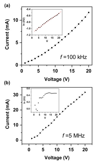 (a) i–v relationship when the device operating at a frequency of 100 kHz. Inset is the ln(i/U)-U curve. (b) i–v relationship when the device is operating at a frequency of 5 MHz. Inset is the ln(i/U)-U curve.