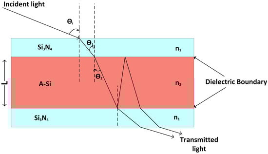 where the angle of refraction () due to the SiN–air interface is determined with the help of Snell’s law. R is the induced reflectance comes from the partially reflecting the SiN–A-Si interface; is the propagation angle inside the A-Si cavity; is the wavelength; is the refractive index of A-Si cavity; the phase shift due to internal reflection at the interface []. The optical thickness of the cavity at different angles can be expressed as follows