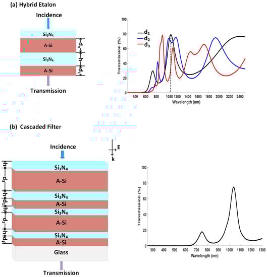 The impact of the thickness of one of the cavities on the transmission spectrum of the hybrid etalon was also studied, as shown in Figure 4a. Cavity I comprises an A-Si layer with cavity thickness nm and was sandwiched between SiN and substrate (SiO) from both ends, respectively. Cavity II comprises an A-Si layer with cavity thickness (multiples of ) and was sandwiched between SiN from both ends. Here, the thickness of SiN nm. It can be seen that, at nm, there was a significant decrease in free spectral range with an increase in the cavity thickness [], which resulted in constructive interference at a distinct peak with = 1050 nm. However, the sidebands were inevitable.