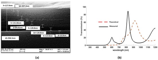 (a) SEM image; and (b) transmission spectrum of measured and theoretical results of multilayered thin-film cascaded filter.