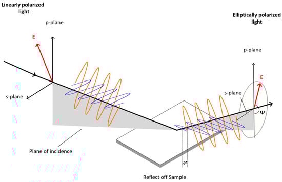 The ellipsometric experiment’s measurement geometry. In the p-s coordinate system, the coordinate system is used to describe the ellipse of polarization. The s direction is defined as parallel to the sample surface and perpendicular to the direction of propagation. The p direction is assumed to be perpendicular to the direction of propagation and lies inside the plane of incidence. The plane of incidence (gray area) is defined as the plane including the input and output beams and the direction which is normal to the sample surface.