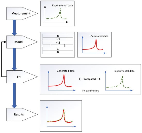 An ellipsometer was used to collect the ellipsometric parameters (, ) within a given spectral range and incident angles. However, the measured data (, ) do not provide direct information. A data analysis procedure was required to extract meaningful physical information about the sample. The following steps are usually included in the data analysis procedure [,], as outlined in the flow chart in Figure 7.