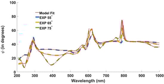 - The fit’s outcomes are assessed. If the results are not satisfactory, the optical model and/or fit parameters are modified, and the data is re-fitted. Mean-squared error (MSE) is a parameter that evaluates the quality of the match between the generated and the experimental data []. Mathematically, it is given aswhere N is the number of pairs, M is the number of variable parameters in the model, and is the standard deviation on the experimental data points. MSE should be positive and near-zero for the maximum likelihood estimate. Figure 8 shows the model fitted to the experimental data with mean-squared error (MSE) = 30.51, when the light is incident at , , and angles.