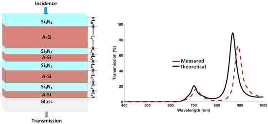 On the contrary, thin film design have received the attention of researchers because, in general, the fabrication steps in thin films are minimal and the fabricated/deposited films are insensitive to light polarization. However, the films show high dependency on the incident angle of light. This issue has been addressed by many researchers [,,,] using highly refractive index materials, such as A-Si, that allows high angle invariance by blocking a big portion of the visible region. In another approach, Ji et al. [] used a seven-layer stack of SiN and A-Si, which blocked the visible region but allowed NIR transmission. In the visible region, the blocking of the light is a drawback; however, this could be a useful feature for NIR filtering. Therefore, here, we manipulated the thicknesses and the number of layers in the stack to demonstrate NIR filtering with high transmission efficiency and narrow bandwidth. A summary of the discussed examples and other reported works is provided in Table 1.