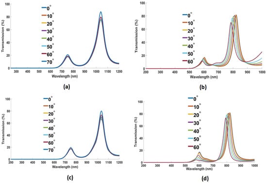 Figure 11a,c show the impact of incident angle () of incident light on the device’s performance, where light polarization is in TM and TE mode, respectively. It can be deduced from the obtained simulated plots in Figure 11a,c that the transmission spectrum remains unchanged till . However, the results obtained through spectroscopic ellipsometry, in Figure 11b,d, show angle invariance up to .
