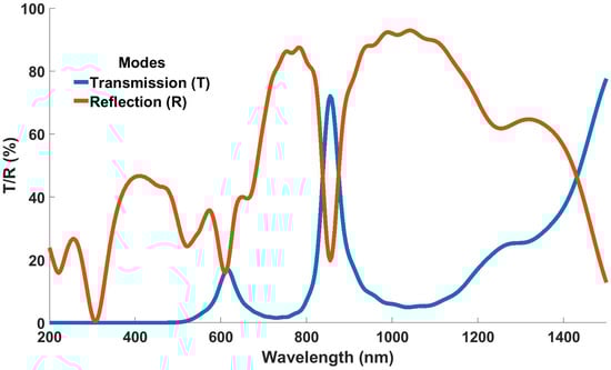 The design was further evaluated for its operation in reflection mode. The results in Figure 12 show that the cascaded multilayered thin-film filter is capable of operating in transmission and reflection modes.