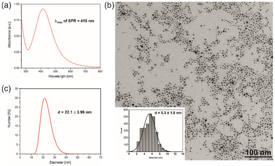 DLS analysis allowed us to investigate the size and dispersity of synthesised N-AgNPs, including a stabilisation layer attached to the surface of the nanoparticles. The size distribution calculated by the number is shown in Figure 1c. The average size is 22.1 ± 3.96 nm; thus, the size dispersity is narrow. The thickness of the stabilisation layer with the solvation layer can be calculated as ca. 15 nm (from TEM and DLS measurements).