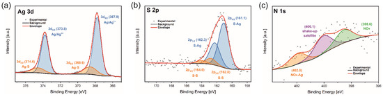 Figure 2a displays the XPS spectrum of Ag 3d. The spectrum consists of two intense peaks with binding energies 373.8 and 367.8 eV and two peaks with significant lower intensity at 374.6 and 368.6 eV, all with the same full width at half maximum (FWHM) in each pair (1.03 and 1.84 eV). These two doublets correspond to 3d5/2 and 3d3/2 orbitals in the different atomic surroundings. A distinct characteristic for silver nanoparticles spin-orbit separation of 3d orbitals equal to 6 eV [44] is observed between the signals in both pairs. The peaks with smaller intensity are shifted to higher energies than observed for a bulk silver Ag0 (368.2 eV for 3d5/2 and 374.2 eV for 3d3/2). Such bond energies of Ag 3d orbitals were observed for thiolate bonds with a silver (Ag-S) [42,45]. These silver atoms, which form the Ag-S bond, consist of ca. 20% of all silver atoms in the sample. It shows that the fabricated nanoparticles are densely grafted with thiolate-connected ligands.