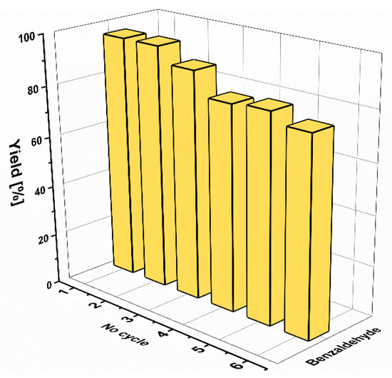 Firstly, we showed that, in consecutive catalytic cycles, it is still possible to obtain a very high yield; enough time extension is only required. For example, oxidation of benzyl alcohol processing for 4 h allows the reception of 100% conversion and 96% yield in the second catalytic cycle (Table 3—experiment 1 and Table S4). We continued these experiments (performing consecutive cycles for 4 h) until the yield was below 80%. As it turned out, the yield was still high after the 6th catalytic cycle and equalled 78% (Figure 4). We used the reaction conditions of benzyl alcohol oxidation for furfuryl alcohol (experiment 4). For the latter, a yield below 80% was noted in the second cycle; however, it was still very high, higher than 70% (Table 3, entry 15). A similar trend (yield below 80% in the second cycle but still very high, higher than 70%) was observed for oxidation of benzyl alcohol and 4-pyridnemethanol in the presence of a lower amount of N-AgNPs (Table 3, entries 9 and 12—experiment 2 and 3, respectively). Although high conversions and yields are obtained for primary aromatic alcohols, we noted significantly less satisfactory results for n-heptanol, 1-phenylethanol and allylic alcohol (Table 3). Moreover, substantially lower selectivity (below 90%) of the catalyst in the oxidation of n-heptanol and 1-phenylethanol were observed. Such results indicate that N-AgNPs are selective towards primary aromatic alcohols. The differences between results obtained for primary and secondary alcohols may be a consequence of the deactivation of N-AgNPs by the latter. To confirm or reject this hypothesis, we performed oxidation of furfuryl alcohol—additional experiments (Table 3—experiment 8, see footnote g under Table 3)—in the presence of N-AgNPs recycled from the reaction mixture after the first cycle of oxidation of 1-phenylethanol. Surprisingly, a high yield of furfural was observed for a few cycles. Such results indicate that N-AgNPs are still catalytically active (but neither towards secondary aromatic alcohols nor aliphatic and allylic ones). Based on the obtained results, we can conclude that the designed catalytic system based on the N-AgNPs is highly selective and active toward primary aromatic alcohols.