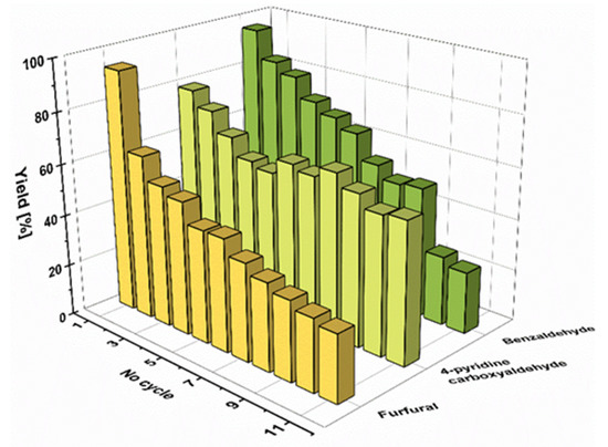The yields of benzaldehyde, 4-pyridinecarboxaldehyde and furfural in eleven consecutive cycles using N-AgNPs (performed according to the description in Table 4).