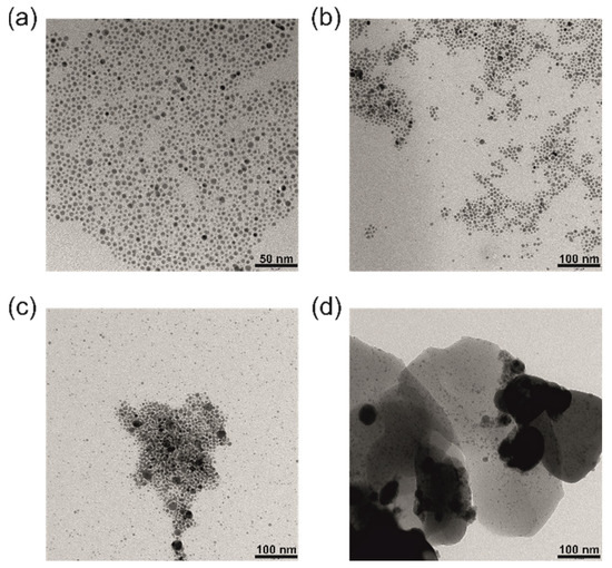 TEM images of N-AgNPs used in the first cycle of oxidation benzyl alcohol (a) separated after 2nd cycle (b) 4th (c) and 11th (d) performed under conditions described in Table 4.