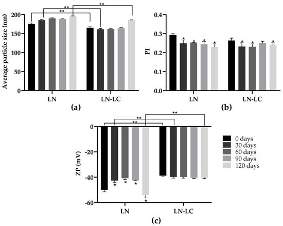 Synthesized LN were evaluated with respect to their average particle size (nm), PI, and ZP (mV), which are essential physicochemical parameters that are necessary in order to obtain information concerning the appearance, consistency, and stability of colloidal systems [31]. The measurements of unloaded and loaded LN (LN–LC) were performed immediately after production and 30, 60, and 120 days of storage in the dark, at 25 °C (Figure 1).