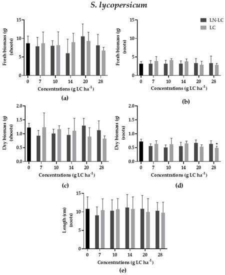 Variation of fresh biomass of shoots and roots (a,b), dry biomass of shoots, and roots (c,d) and length (e) of roots of S. lycopersicum after exposure to LC (light) and LN–LC (dark). The concentrations tested are based on the amount of LC. Results are represented by mean ± SD values. Asterisks mark the significant differences compared to the control group (0 g LC ha−1) ((a,b) p < 0.05, Dunnett; (c–e) p < 0.05, Dunn’s).