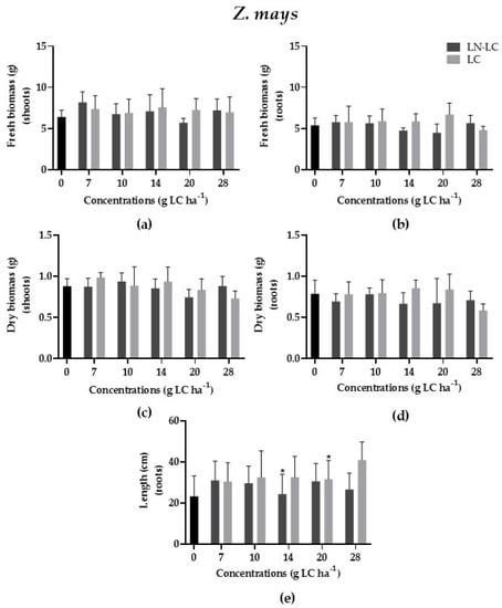 The effect of nanoformulations loaded with LC was evaluated by using a monocotyledonous plant, Z. mays, and a dicotyledonous plant, S. lycopersicum. According to the results, no statistically significant differences were recorded on the fresh biomass of the shoots (p > 0.05; F (12, 50) = 1.210) and roots (p > 0.05); F (12, 50) = 0.9060) of S. lycopersicum (Figure 2a,b); moreover, no significant differences were recorded on the fresh biomass of the shoots (p > 0.05) and roots (p > 0.05; F (12, 50) = 1.230) of Z. mays (Figure 3a,b) after exposure to increasing concentrations of LC and LN–LC by foliar application when compared to the control group. Thus, LN–LC demonstrated itself to be safe for the plants selected in this study. However, LC negatively affected the dry biomass of the roots of S. lycopersicum (LOEC = 28 g LC ha−1, NOEC = 20 g LC ha−1; p < 0.05; Kruskal–Wallis statistics value = 21.44), as indicated in Figure 2d, while LC stimulated Z. mays root length at 20 g LC ha−1 (p < 0.05; F (12, 302) = 5.01) (Figure 3e). No statistically differences were recorded for both species after exposure to DMSO at 5% (v/v) in comparison with the control group (data not shown).