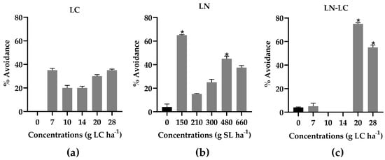 Percentage avoidance of E. fetida after exposure to different concentrations of LC (a), LN, (b) and LN–LC (c). The concentrations tested are based on the amount of LC. In the case of LN, the concentrations indicated are of solid lipid (SL) used in the synthesis of LN. The same concentrations of SL were tested for LN–LC. Results are represented by mean ± SD values. Asterisks mark significant differences compared to the control group (0 g LC or LS ha−1) (p < 0.05, Fisher´s test).