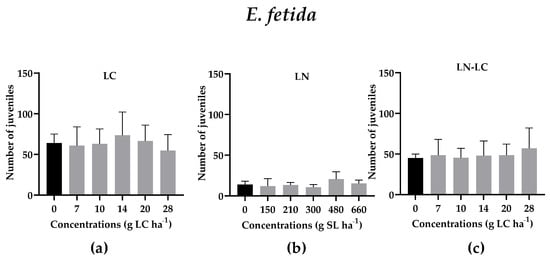 Despite the avoidance results, the reproduction tests with E. fetida were not affected by the presence of LN (p > 0.05; F (5, 19) = 1.054) and LN–LC (p > 0.05; F (5, 19) = 1.643) after 56 days of exposure to increasing concentrations when compared to the control group (Figure 5b,c), and no statistical differences were recorded after exposure to DMSO at 5% (v/v) (data not shown). Although there are no data regarding the effect of LN on oligochaetes, for comparison, and despite being a work where a surfactant was tested, a study conducted by Gavina et al. (2016) showed that the earthworms Eisenia andrei significantly avoided the contaminated soil with nanovesicles made from the anionic surfactant sodium dodecyl sulphate and the cationic lipid didodecyl dimethylammonium bromide (SDS/DDAB), while the reproduction of the same invertebrates was not affected, probably by the rapid degradation of the vesicles in the soil [41]. Since the nanoparticles in the present study were produced by using lipids, it is possible that, initially, the earthworms were affected by their presence, but along the time, these LN can be (bio)degraded, and the soil habitat function can be restored. The reproduction of E. fetida was not also significantly affected by LC as shown in Figure 5a and the survival of adult earthworms was not affected when exposed to LN and LC (data not shown) at the concentrations tested. However, there are studies that state that LC is very toxic to E. fetida due to the high cutaneous absorption of these compounds by earthworms (LC50 from 1055 to 2570 g ha−1) [42], but these concentrations are higher than those tested in our study, which are likely more ecologically relevant, as they are close to the application dose.