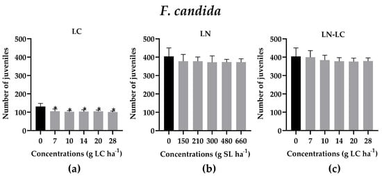 F. candida juveniles after the exposure of adults to different concentrations of LC (a), LN (b), and LN–LC (c). The concentrations tested are based on the concentration of LC in the commercial formulation. In the case of LN, the concentrations indicated are of solid lipid (SL) used in the synthesis of LN. The same concentrations of SL were tested for LN–LC. Results are represented by mean ± SD values. Asterisks mark the significant differences compared to the control group (0 g LC ha−1) (p < 0.05, Dunnett).