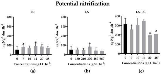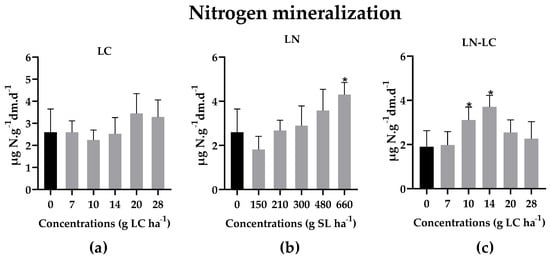 Nitrogen mineralization activity in soils exposed for 15 days to different concentrations of LC (a), LN (b), and LN–LC (c). The concentrations tested are based on the amount of LC. In the case of LN, the concentrations indicated are of solid lipid (SL) used in the synthesis of LN. The same concentrations of SL were tested for LN–LC. Results are represented by mean ± SD values. Asterisks mark the significant differences in relation to the control group (0 g LC ha−1): (c) p < 0.05, Dunnett; (a,b) p < 0.05, Dunn’s.