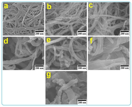 SEM images at the same magnification of SWCNT/PPyl nanocomposites. Images of pure SWCNT and PPy are also shown. (a) SWCNT, (b) PW1, (c) PW2, (d) PW3, (e) PW4, (f) PW5, and (g) PPy.