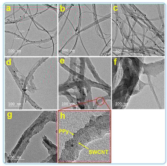 The surface morphology and microstructure of the produced SWCNT/PPy nanocomposites were investigated by both SEM and TEM techniques, as shown in Figure 1; Figure 2. The SEM images show that the PPy was clearly formed on the sidewalls of the SWCNT, resulting in a one-dimensional (1D) nanocomposite (Figure 1). SEM images reveal that the PPy smooth coating had a considerable impact on the diameter of the SWCNT. As a systematic coating could be seen, smaller amounts of PPy could result in thinner shells/layers of PPy on the walls of SWCNT, while higher amounts of PPy could produce thicker layers of PPy. This coating was achieved by using different amounts of PPy (increasing the amount of PPy from 0.05 to 2 mL) and fixing the amount of SWCNTs, as displayed in Table 1. As shown in Figure 1a, the SWCNTs exist mostly in bundles with various diameters, and therefore, the formed core shell nanocomposites are present in various diameters (Figure 1b–f), which can be also seen clearly in the TEM images in Figure 2. From this figure, the uncoated and coated PPy-SWCNT with different PPy layer thicknesses show a similar trend to that observed in SEM images. As the amounts of PPy increase, the coating thickness increases, as shown in Figure 2a–g. Moreover, it can be clearly seen the SWCNT is situated in the cores of these 1D structures, whereas the PPy forms the shells (Figure 2h). This kind of smooth coating was also observed previously in MWCNT/PPy [25].