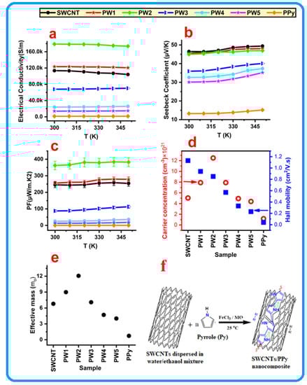 TE performance of the SWCNT/PPy nanocomposites as a function of the temperature (a–c). The charge carrier concentration, Hall mobility (d), effective mass (e) at RT of the pure PPy, SWCNT, and SWCNT/PPy nanocomposite samples are also shown. (f) is a schematic illustration showing the π–π conjugation interaction between Ppy and SWCNT during the polymerization.