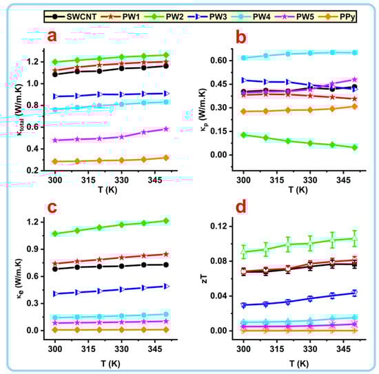 where L is the Lorenz number, is Boltzmann’s constant, and e is the electron charge. The values of , and of the neat PPy, SWCNT, and SWCNT/PPy core shell nanocomposites (PW1–PW5) are presented as a function of temperature in Figure 4a–c.