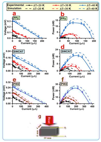 A thermoelectric generator (TEG) is a small and solid-state apparatus employed to convert heat energy into electricity by a phenomenon called the thermoelectric Seebeck effect. In TEG devices, several factors should be examined, including the output voltage (V), current (I), and power (P) of the single-leg module generated by the temperature gradient between the two sides of a pressed compact. In real conditions, the power generation characteristics of the single cuboid-shaped leg modules composed of SWCNT, PPy, and SWCNT/PPy nanocomposite (PW2) were examined, and the results are given in Figure 5a–f. The measured V and P as a function of I under different ΔT showed that the SWCNT/PPy nanocomposite exhibited improved TE power compared to the individual samples. The dimensions of a single cuboid leg module are presented in Figure 5g. It can be seen that the V linearly decreases as the I increases at a fixed ΔT, and this I–V linear relationship remains unaltered when ΔT is changed; therefore, Ohm’s law holds true at any ΔT. Moreover, the V increased proportionally with the increase in ΔT due to the Seebeck effect. It has been also noted that the slopes of all I–V curves are nearly identical, demonstrating that ΔT has no major effect on the internal resistance (R) of all samples. As ΔT increases, the output power also increases; at ΔT = 40 K, the Pmax of 24.42 nW (the equivalent power density is ~61 nW/cm2) was achieved for the PW2 sample. The experimental results were also validated by generating numerical simulation curves (Figure 5a–f). These curves were generated by a three-dimensional ANSYS numerical model with 20 node coupling elements, SOLID226, selected to simulate the thermoelectric current and voltage, similar to the work reported in the literature [48,49,50,51]. More details about this model are described in the Supplementary Data. From the figure, it can be concluded that the numerical simulation curves are in agreement with the experimental results.