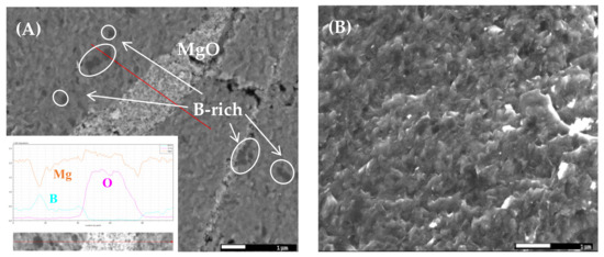 (A) SEM micrograph of sample A showing the unreacted boron and MgO regions in the MgB2 matrix. (B) High-magnification SEM image of nano MgB2 grains. The inset of Figure 2A shows the EDS red-line region scan curves of boron (cyan line), oxygen (magenta line) and magnesium (orange line).