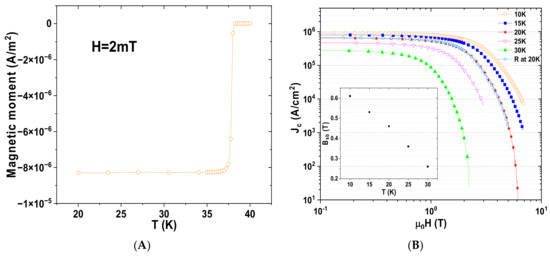 The magnetic moment of sample A as a function of the temperature is plotted in Figure 3A. The onset of the superconducting transition occurred at 38.25 K, and there was a narrow transition width (ΔT around 1 K). As shown in Figure 3B, for low values of field B, the critical current density Jc showed an invariant behavior with respect to the applied magnetic field; this plateau became smaller and smaller as the temperature increased. This behavior may indicate that the grain connectivity, or the packing ratio, which influences Jc in the self-field [23], is very good in the samples. This behavior is well-described by the ‘collective pinning’ model [24] with a dynamic state of the ‘single vortex’ flux pinning regime. This flux dynamic regime reveals the importance of defects in nanometric dimensions at the grain boundaries in this applied magnetic field range (Figure 2B). For larger values of the magnetic field, a crossover field, Bsb, from a ‘single vortex’ to a ‘small-flux bundle’, can be identified from the change in slope in Figure 3B. The inset in Figure 3B shows Bsb (T), which, as expected, is a decreasing function of the temperature. This quantity corresponds to the field for which Jc(B) = 0.95 ∗ Jc(0) [25]. This behavior due to the ‘boundle flux pinning’ regime for higher applied B values shows a critical current exponential decrease [23]. It is probable that in this magnetic region, the grains boundaries of the very small grains present in the material could dominate the pinning behavior in a high magnetic field [26]. At 20 K, a high Jc = 6.75 × 105 A/cm2 in the self-field was measured. Remarkably, under 4 T, the critical current density was above 104 A/cm2, which is an extremely high critical current density at this temperature. Another possibility is that the pinning was due to the tensile stresses between the MgO precipitates or the areas rich in boron visible in Figure 2A on the one hand and the MgB2 zones on the other hand. This phenomenon was previously observed in a SiC-MgB2 bulk [4], where for B ≈ 4 T and T = 20 K, Jc was reported to be in the range of the values presented here.