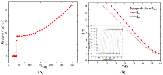 (A) Temperature dependence of the resistivity of sample A at 0 T with a 5 mA direct current. (B) Temperature dependence of Bc2 and Birr for the same sample. The inset shows the resistivity transition at fields ranging between 0 T and 14 T with a direction perpendicular to the SPS sintering pressure.