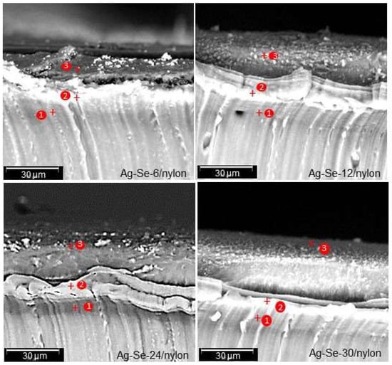 Cross-sectional micrographs of Ag–Se/nylon samples with marked points where the elemental composition was determined by Phenom ProX-SEM-EDS.