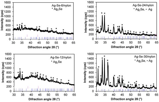The crystallographic structure of the Ag–Se/nylon nanocomposites was studied by XRD analysis. Our previous XRD studies of the nylon matrix showed that the diffraction pattern features two dominant peaks at 2θ 20.1° and 23.5°, and the peak at 9.4° of lower intensity [29]. As the intensities of nylon XRD peaks sharply exceeded the XRD patterns of the obtained composites, the diffractograms are given in the 30–65° 2θ angular interval. The experimental data were interpreted by using the standard JCPDS cards and the data available in the literature [5,30]. Analysis results are presented in Figure 4.