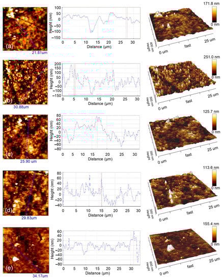 AFM views (left—2D views; center—profile; right—3D views) of (a) uncoated nylon, (b) Ag–Se-6/nylon, (c) Ag–Se-12/nylon, (d) Ag–Se-24/nylon, (e) Ag–Se-30/nylon.