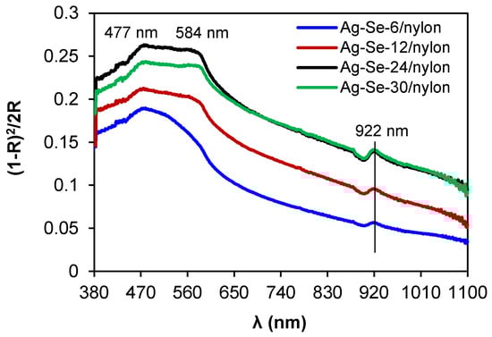 In the spectrum of the Ag–Se-6/nylon sample (Figure 7), the maximum absorption peak was located at 477 nm, accompanied by a shoulder peak at 584 nm.