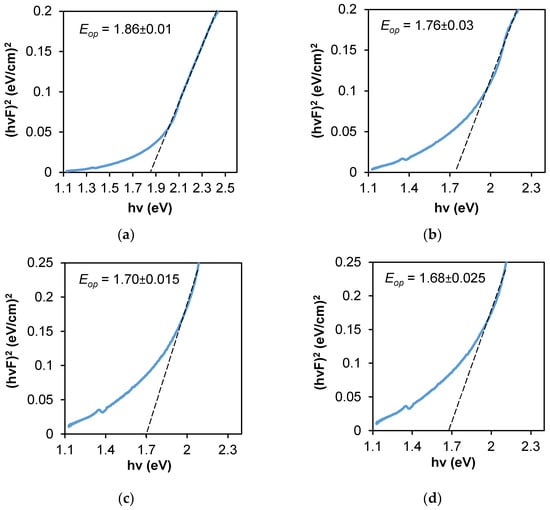where F—the Kubelka–Munk function, R—the reflectance, hν—the photon energy, and Eop is the optical band gap, n is a constant characterising the transition mode, n = 1/2 or 2 are for the allowed direct or indirect transitions, respectively.