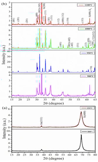 The structures and phase purity of the as-grown Ga2O3 nanostructures were characterized by XRD. Figure 2 shows the XRD patterns collected from the samples grown at different temperatures of 800–1100 °C. At low temperatures of 800 and 850 °C, no diffraction peaks of β-Ga2O3 were found, as shown in Figure 2a. The peaks from Au(111) and Si(400) were present, which is similar to those from the Au-NP-coated Si substrate, as shown in Figure S1a in the Supplementary Materials. This agrees with the FESEM results in Figure 1b, which showed no growth of β-Ga2O3 nanostructures at 800 °C. As the temperature increased to 900 °C, the Au(111) and Si(400) peaks were still present along with other weak peaks from the Si substrates (i.e., Si(200), and Si(400) from Cu Kβ radiation—see Figure S1b in the Supplementary Materials). However, new XRD peaks other than the above were observed, as indicated by the XRD patterns shown in Figure 2b for this temperature and other temperatures at 950–1100 °C. For these XRD spectra in Figure 2b, only 2θ values up to 65 °C were shown to avoid the overloading of the Si (400) peak. These new XRD peaks can all be indexed to the β-phase of Ga2O3 with a monoclinic structure according to ICDD 41-1103, with the strongest peaks assigned to (400), (002)/(-202), (111), and (-311). With a further increase in temperature to 950 and 1000 °C, the intensities of all β-Ga2O3 peaks increased with a total of 24 peaks at 1000 °C. No other phases (α, γ, δ, and ε) of Ga2O3 were observed in the XRD analysis of our as-grown samples, indicating that high-purity and single-phase β-Ga2O3 nanostructures were produced from the CVD growth. As the density of NWs decreased for the sample prepared at T = 1100 °C as observed in the FESEM image (Figure 1h), the diffraction peak intensities of β-Ga2O3 were reduced, accompanied by an increase in the peaks from the Si substrate (i.e., (200) and (400)).