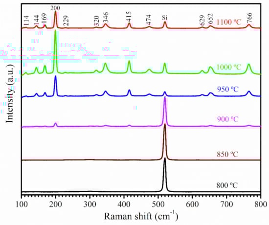 Figure 3 shows the room-temperature Raman spectra of the β-Ga2O3 nanostructures prepared at different growth temperatures in the frequency range of 100–800 cm−1. The Raman spectra of the samples at 800 and 850 °C only showed the peak at 520 cm−1 from the crystalline Si substrate, in excellent agreement with the results from XRD and FESEM analysis indicating no growth of β-Ga2O3 nanostructures at these two temperatures. Eleven out of the fifteen Raman active modes as reported in the literature for bulk β-Ga2O3 [] were observed for samples prepared at temperatures >900 °C. The sharp peaks from β-Ga2O3 in the Raman spectra as shown in Figure 3 indicate good crystallinity in the prepared samples, which agrees well with the XRD analysis of the same samples in Figure 2. Dohy et al. classified the 15 Raman active modes of bulk monoclinic β-Ga2O3, belonging to the C2h group, into three regions []. They are the low-frequency (≤200 cm−1), mid-frequency (300–500 cm−1), and high-frequency (500–800 cm−1) modes, related to the libration and transformation of the Ga2O6 octahedra—GaO4 tetrahedra chain, deformation of the Ga2O6 octahedron, and stretching and bending of the GaO4 tetrahedron, respectively. If we compare the Raman peaks of the β-Ga2O3 NWs and NSHs produced at 1000 and 1100 °C with those from the bulk material, a very small red shift of 1–3 cm−1 was observed mostly in the low-frequency region, whereas a very small blue shift of 1–3 cm−1 appeared towards the high-frequency region. Gao et al. [] reported a red shift of 4–23 cm−1 for the β-Ga2O3 nanorods, and Dai et al. [] found a 30 cm−1 red shift for the nanobelts and NSHs as compared to the bulk β-Ga2O3 powder. The red shift was attributed to the presence of defects and the oxygen vacancies in the nanostructures. On the other hand, Rao et al. [] and Hosein et al. [] observed a blue shift of 10–40 cm−1 and ca. 5 cm−1, respectively, in their β-Ga2O3 NWs relative to the bulk. It was argued that the internal strain in the NWs led to the blue shift in the Raman peaks. The observed small red and blue shifts in this work indicated the presence of defects and strains in the β-Ga2O3 NWs and NSHs produced by the CVD method, but the extent was relatively low compared to the β-Ga2O3 nanostructures previously reported [,,].