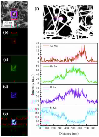 (a) FESEM image of β-Ga2O3 NWs grown at 1000 °C and EDX elemental mapping for (b) Au (red, Mα), (c) Ga (green, Lα), (d) O (purple, Kα), (e) Si (cyan, Kα) over the area marked by the square box in magenta in (a), and (f) EDX line scan across a nanoparticle on the tip of a nanowire as indicated by the magenta line in the FESEM image of β-Ga2O3 NWs grown at 1100 °C.