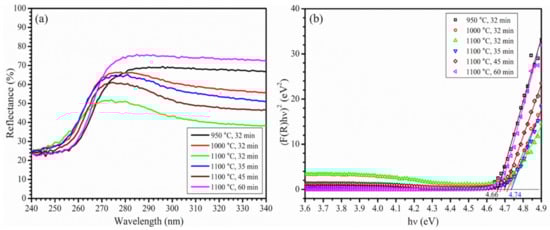 The bandgaps of the as-prepared β-Ga2O3 nanostructures were determined from the diffuse reflectance spectra acquired using the UV–Vis spectrometer. Figure 6a shows the UV–Vis reflectance spectra for the six samples prepared at 950–1100 °C for 32 min and 1100 °C for 35–60 min. The measured reflectance was then transformed to the Kubelka–Munk function, F(R), using the Kubelka–Munk equation []. The F(R) is related to the bandgap, Eg, according to the following Equation (1):